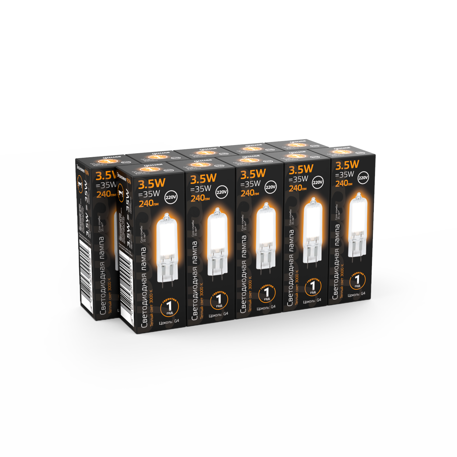 Упаковка ламп 10шт Gauss G4 AC220-240V 3.5W 240lm 3000K стекло LED 1/10/200