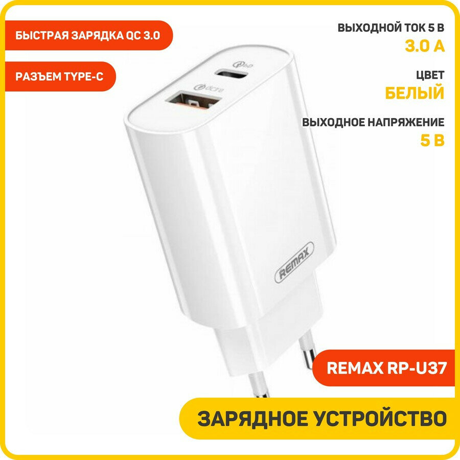 Сетевое зарядное устройство (СЗУ) Remax RP-U37 QC3.0 (USB/Type-C) 3 А, белый информация: