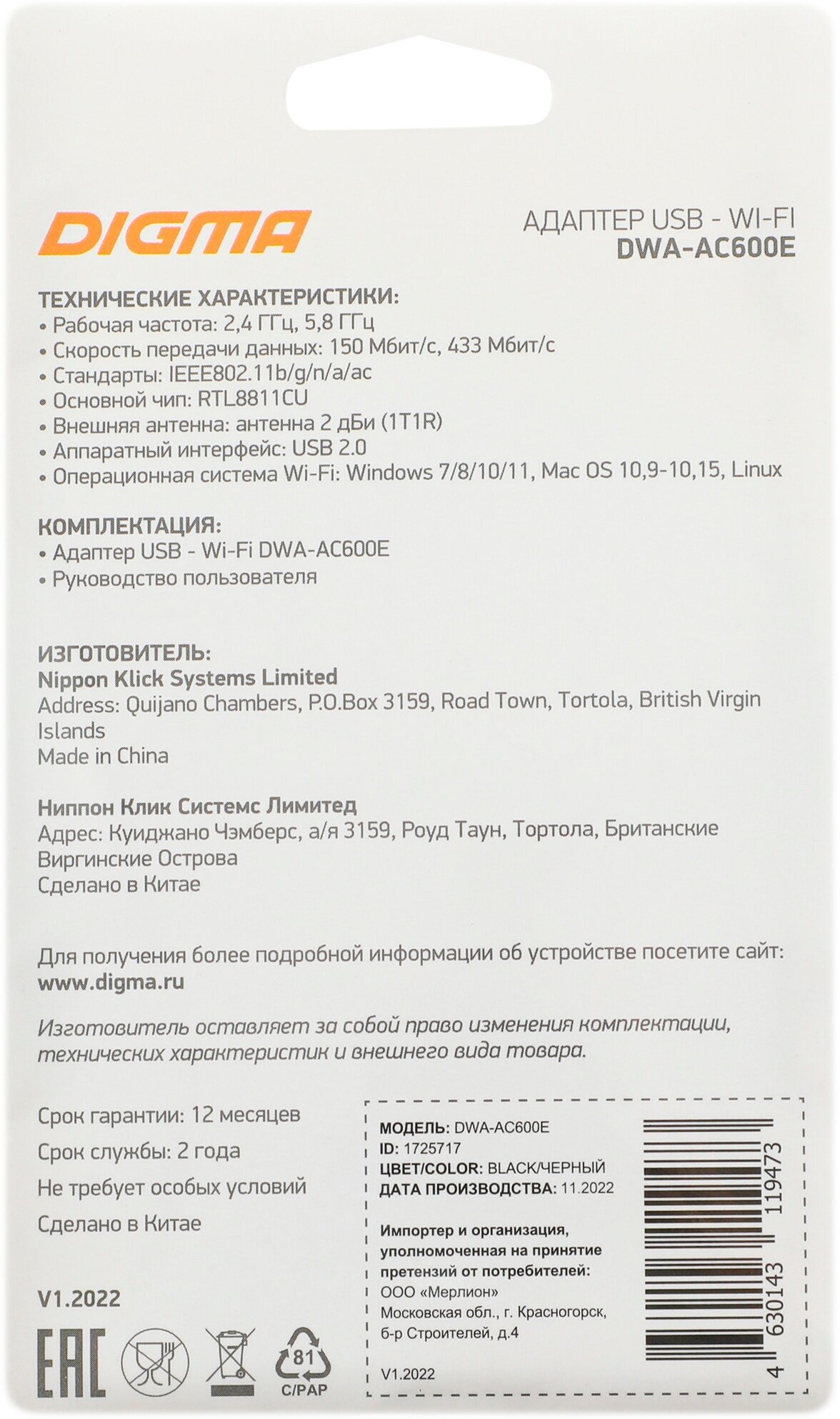 Отзывы на Сетевой адаптер Wi-Fi Digma DWA-AC600E AC600 USB 2.0 (ант.внеш.съем) 1ант. (упак.:1шт)