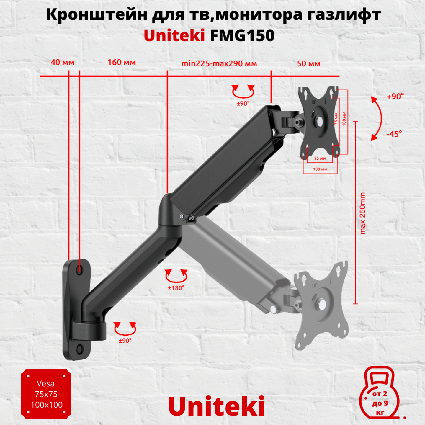 Кронштейн UniTeki FMG150 на стену для телевизора наклонно-поворотный с системой газлифт для диагонали 17-32 дюймов (43-81 см), нагрузка до 2-9 кг