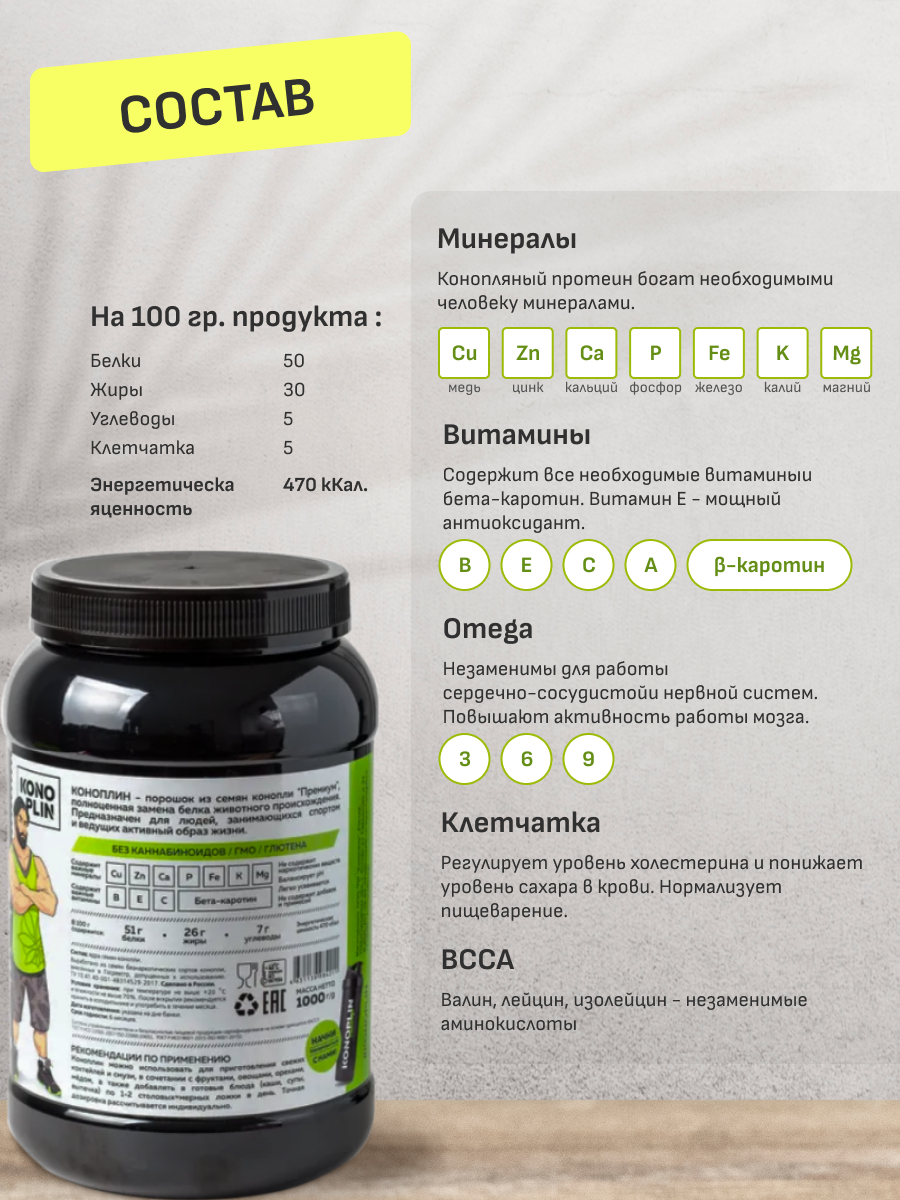 Протеин конопляный, Конопель, коноплин, 1 кг информация: