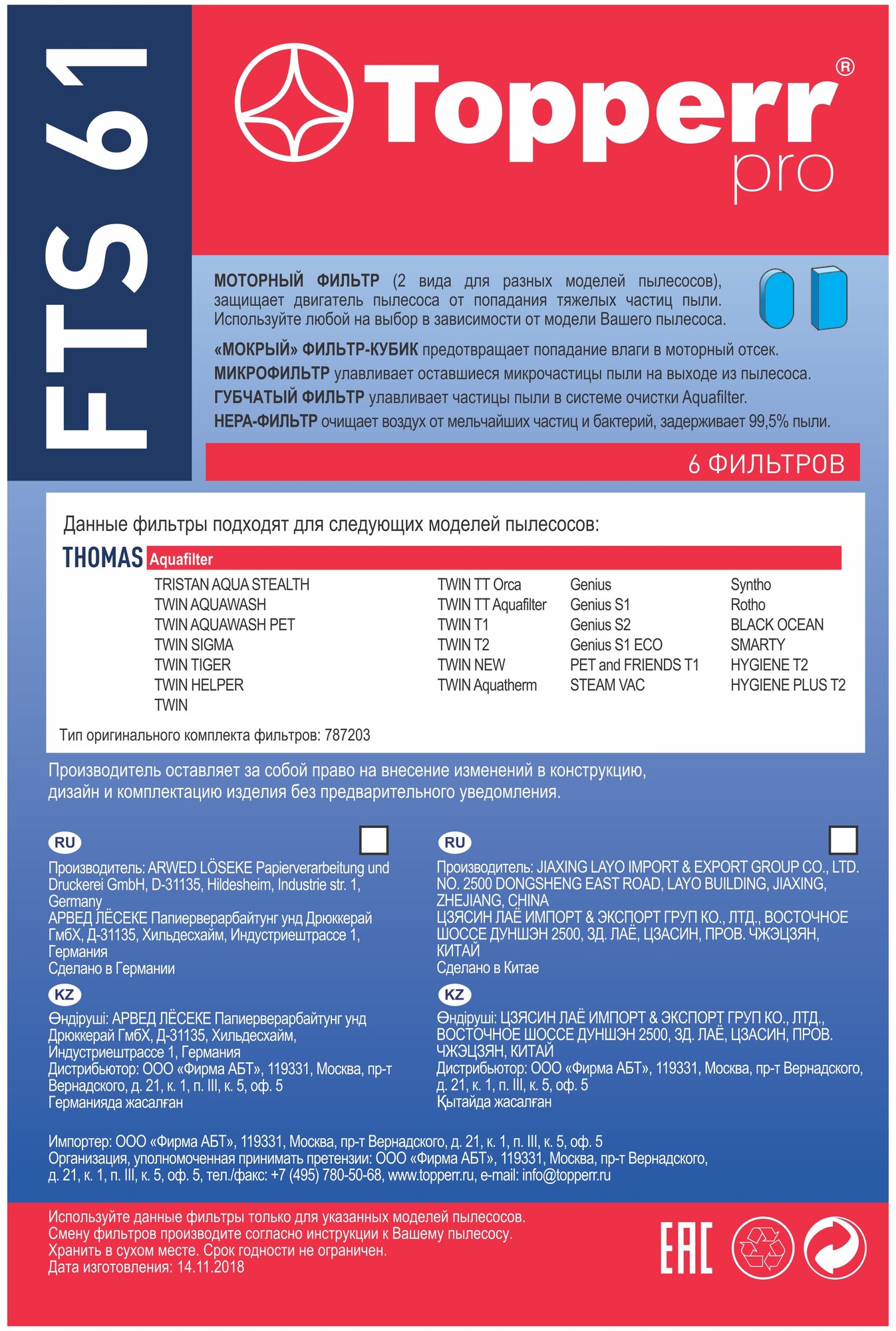 Комплект фильтров TOPPERR FTS 61 для пылес. Thomas Twin, Twin TT, Genius, Synto информация: