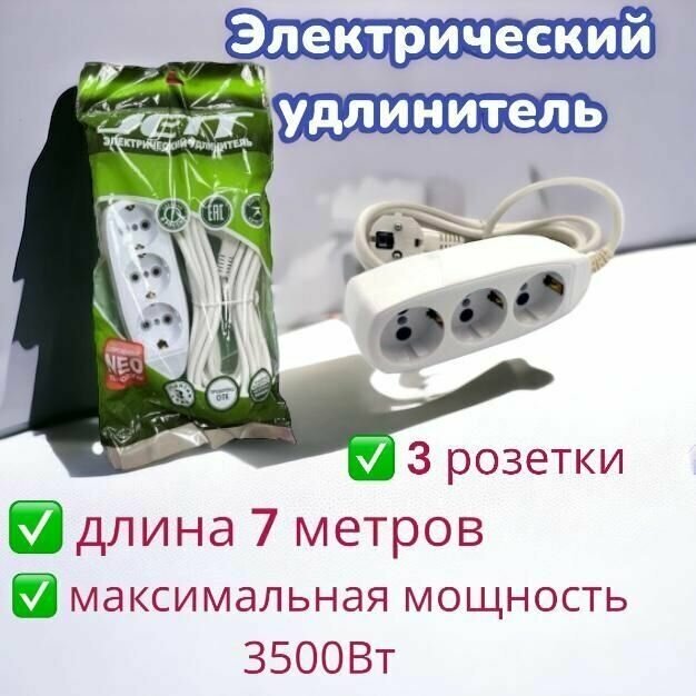 Удлинитель Сетевой ( Бытовой) JETT 7 метров с заземлением 3500 вт информация: