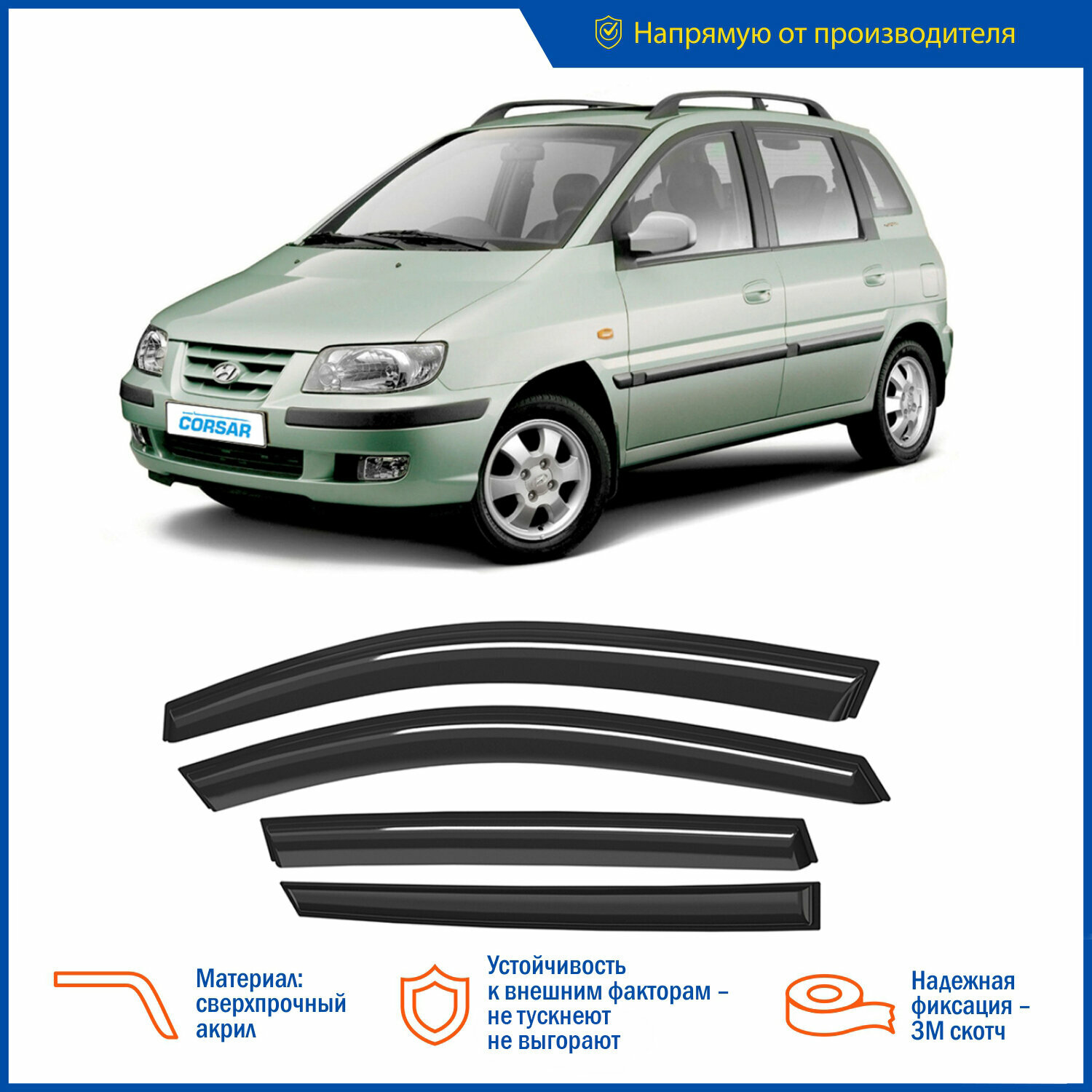 Комплект дефлекторов серия CORSAR Hyundai Matrix 2001-2010 /хетчбек/накладные/скотч/к-т 4шт./