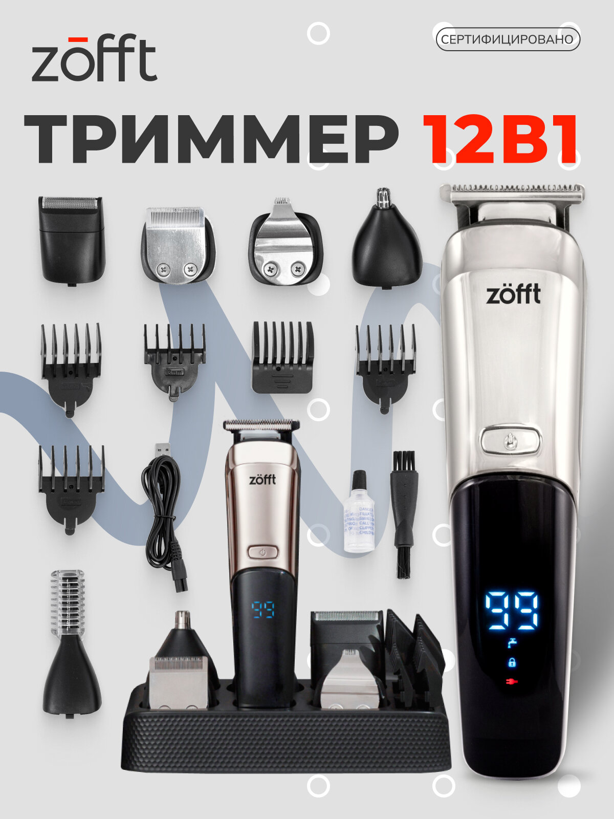 Профессиональный триммер для бороды и тела, 12 насадок, водонепроницаемый, подставка с функцией зарядки Zofft RS301SL 3 570 ₽