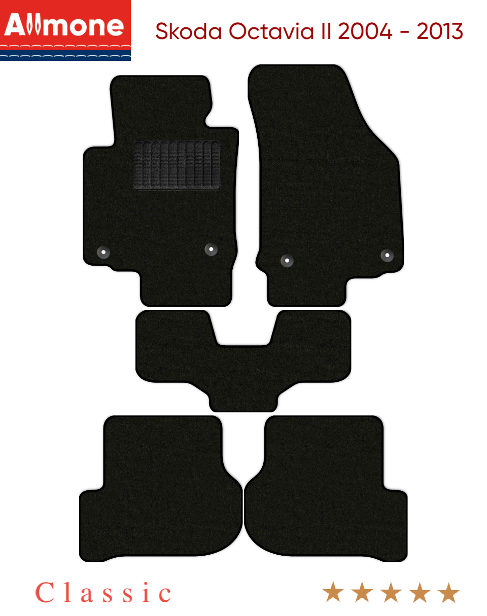 Коврики в салон текстильные Allmone "Классик" для Skoda Octavia 2 (A5) 2004 - 2013, черные, 5шт. / Шкода Октавия 2 информация: