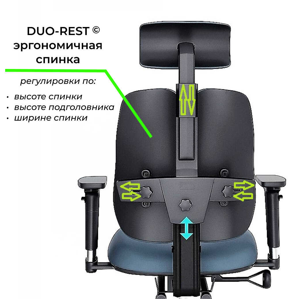 | Регулировка | высоты подголовника / высоты подлокотников / высоты сиденья / высоты спинки / глубины положения подлокотников / глубины сиденья / жесткости качания / наклона спинки / расстояния между правым и левым подлокотником / угла наклона подголовника / угла подлокотников / ширины спинки |