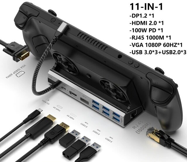 Док станция хаб USB-С 11 в 1 c охлаждением для Steam Deck, Nintendo Switch, RogAlly, KS-is
