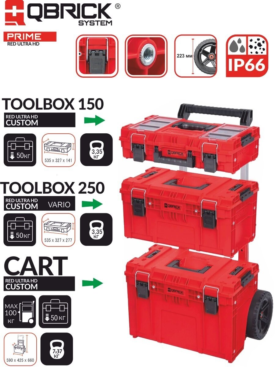 | Подробная комплектация | Qbrick System PRIME Toolbox 250 Vario Red Ultra HD Custom+ 3 перегородки съемные+лоток |