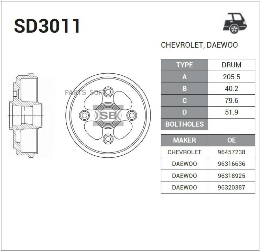 SANGSIN BRAKE SD3011 Барабан тормозной CHEVROLET SPARK I (M100) (2000-2011), DAEWOO MATIZ I (M100) (1998- )/ TICO (1995-2003)