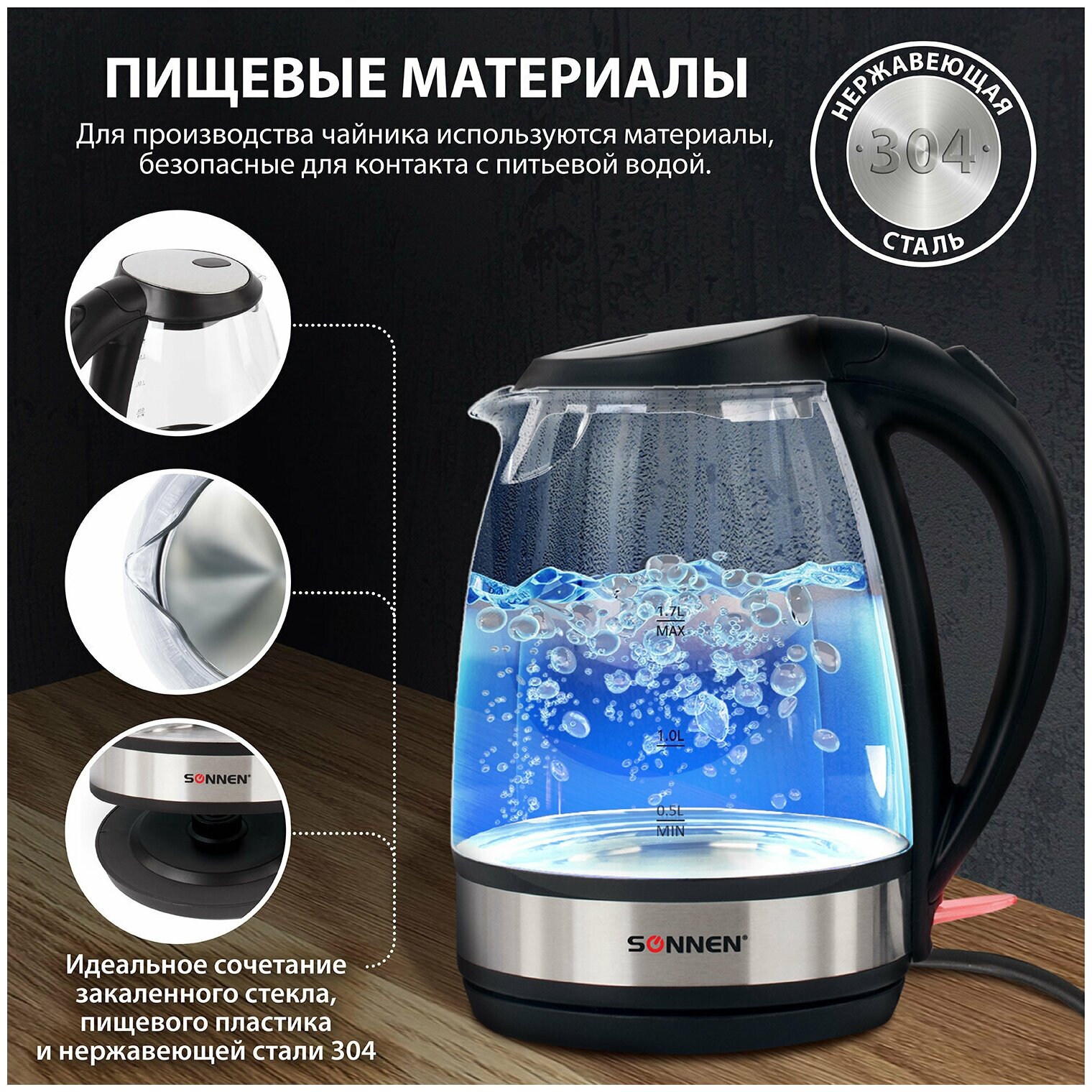 Чайник SONNEN KT-201, 1.7 л, 2200 Вт, закрытый нагревательный элемент, стекло, подсветка, черный 2 101 ₽