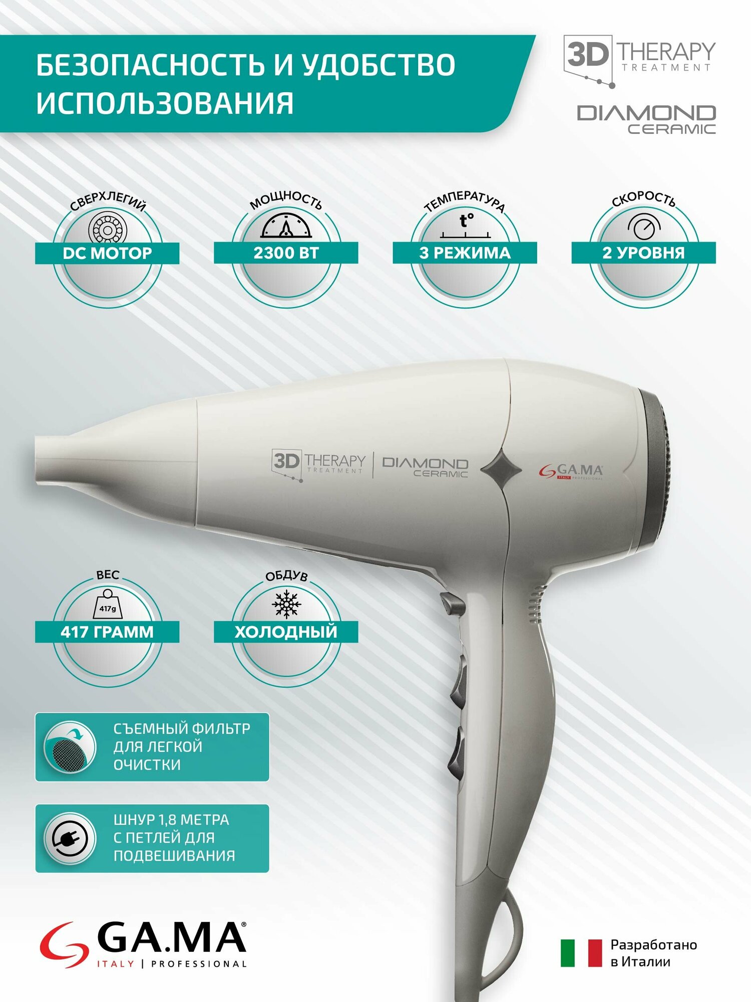 Ga-Ma DIAMOND 3D Фен GA.MA 3D-терапия, ионизация, мощность 2300 Ватт, керамика, белый