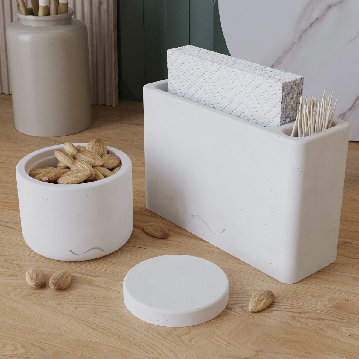 Отзывы на Набор для кухни Musko 22 (салфетница Lina, емкость для сыпучих продуктов Astrid XS с бетонной крышкой), бетон, белый матовый