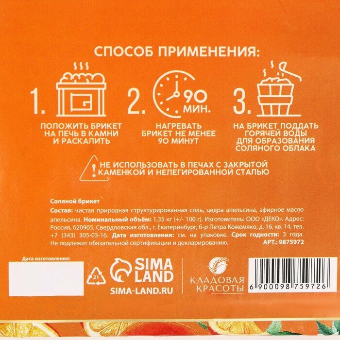 Кладовая красоты Соляной брикет с цедрой апельсина, 1,35 кг информация: