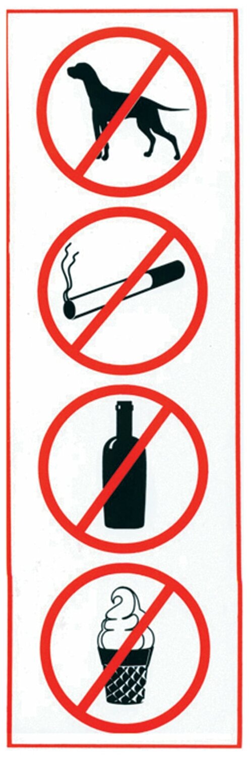 Отзывы на Знак "Запрещение: курить, пить, есть, прохода с животными", прямоугольник, 300х100 мм, самоклейка, 610033/НП-В-Б
