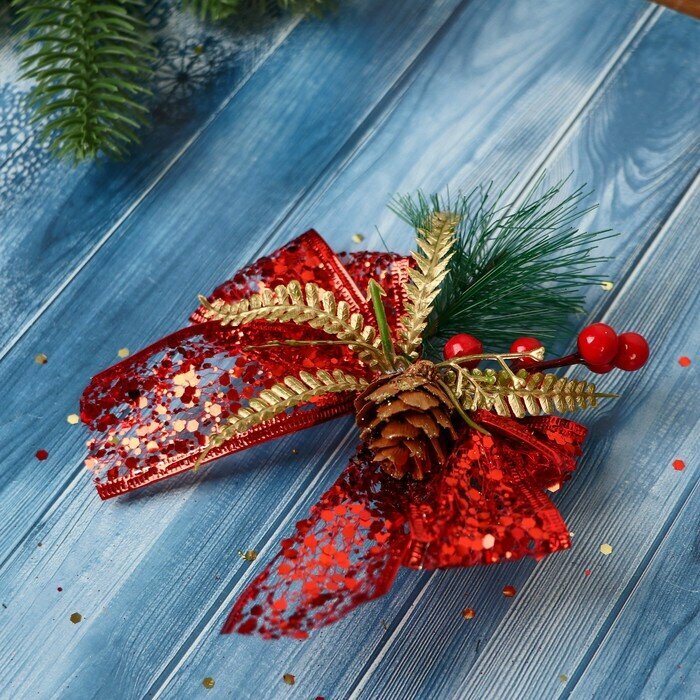 Зимнее волшебство Украшение ёлочное "Еловая композиция" (набор 3 шт) бант блеск шишка, 11х9 см, красный информация: