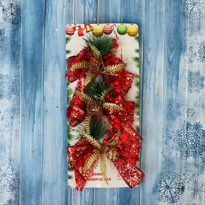 10 цен на Зимнее волшебство Украшение ёлочное "Еловая композиция" (набор 3 шт) бант блеск шишка, 11х9 см, красный
