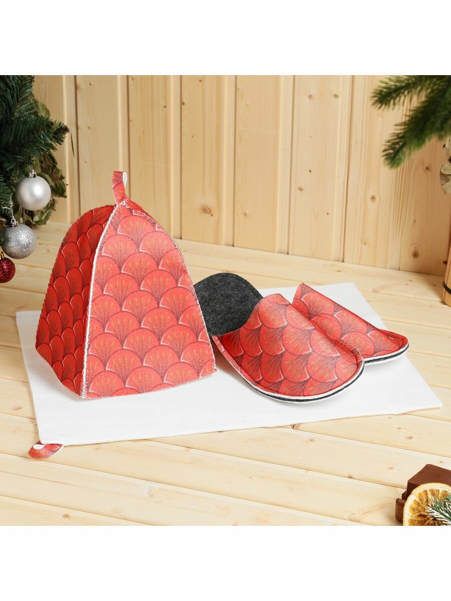 Набор для бани с принтом Огненный дракон шапка тапки коврик информация: