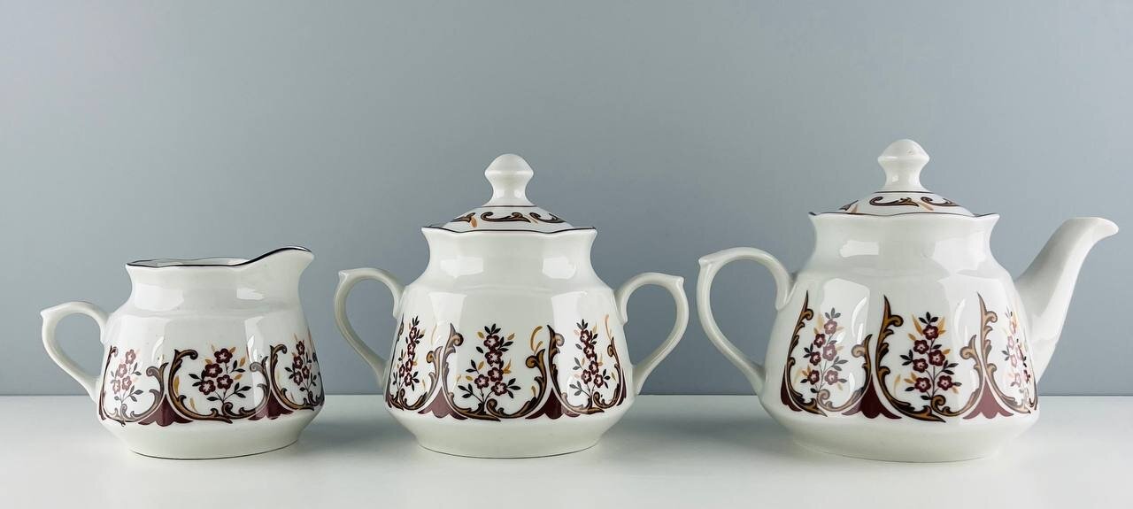 Винтажный чайный набор (чайник, сахарница, молочник-сливочник) "Букет у камина". Фарфор Рижский фарфоровый завод. СССР, 1970-е. информация: