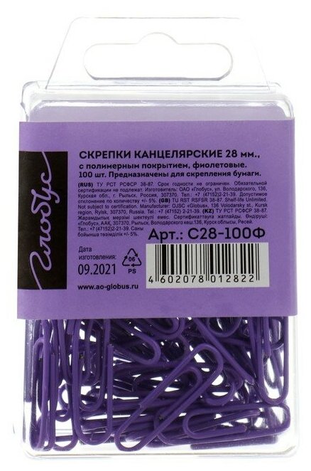 Скрепки канцелярские 28 мм цветные 100шт. GLOBUS фиолетовые, евробокс информация: