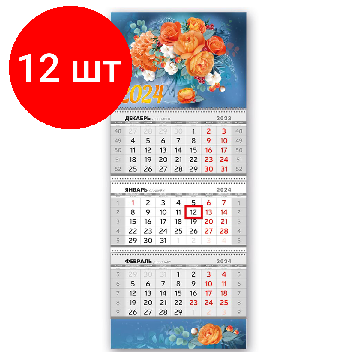 10 цен на Комплект 12 шт, Календарь квартальный 3 бл. на 3 гр. Горчаков ГК "Яркие цветы", с бегунком, 2024г