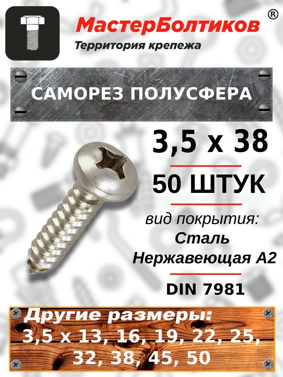 Саморез полусфера 3,5х38 нержавеющий А2 DIN 7981 (50 штук) информация: