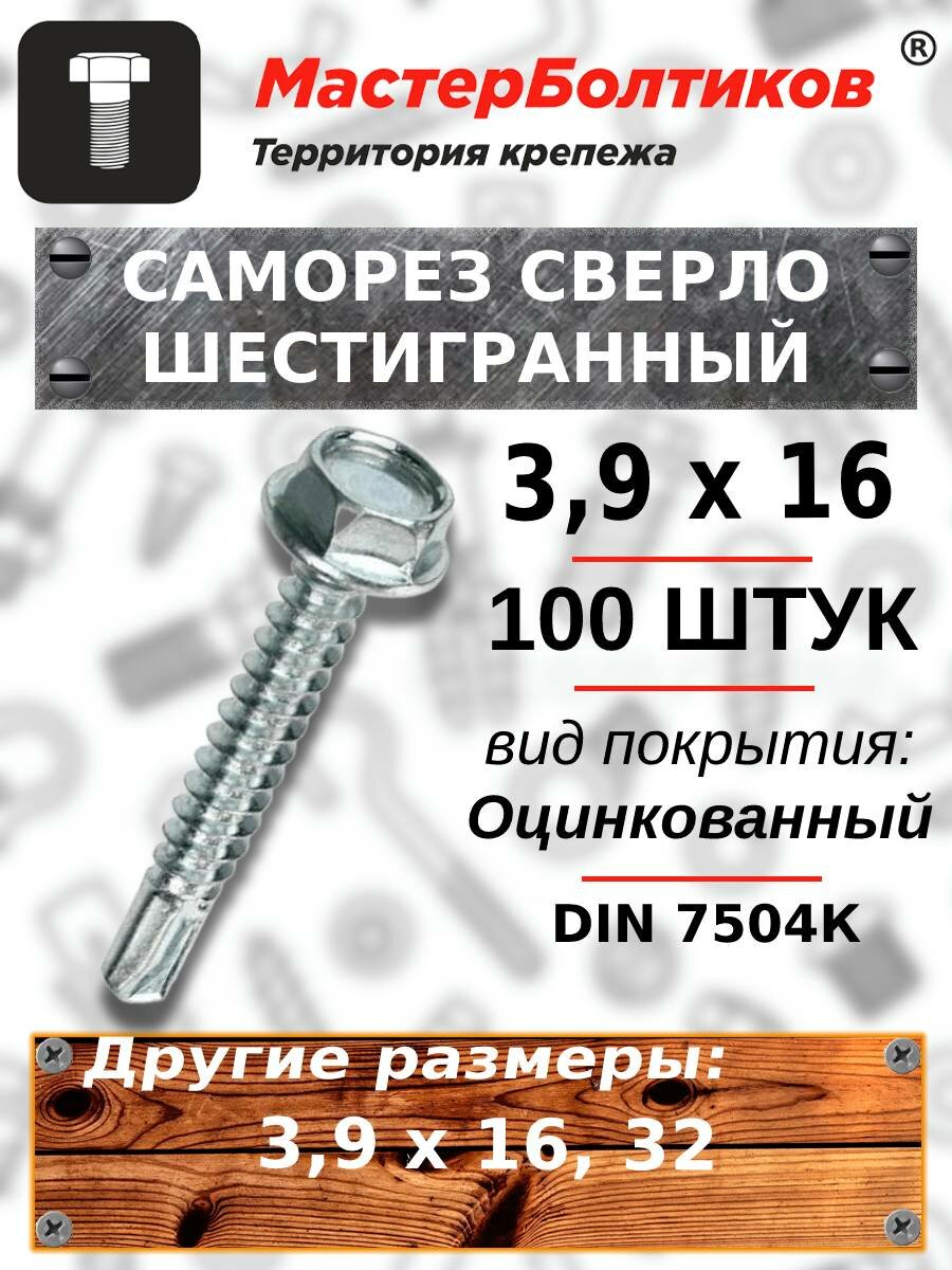 Саморез 3.9х16 шестигранная головка сверло оцинкованный DIN7504К (100 штук) информация: