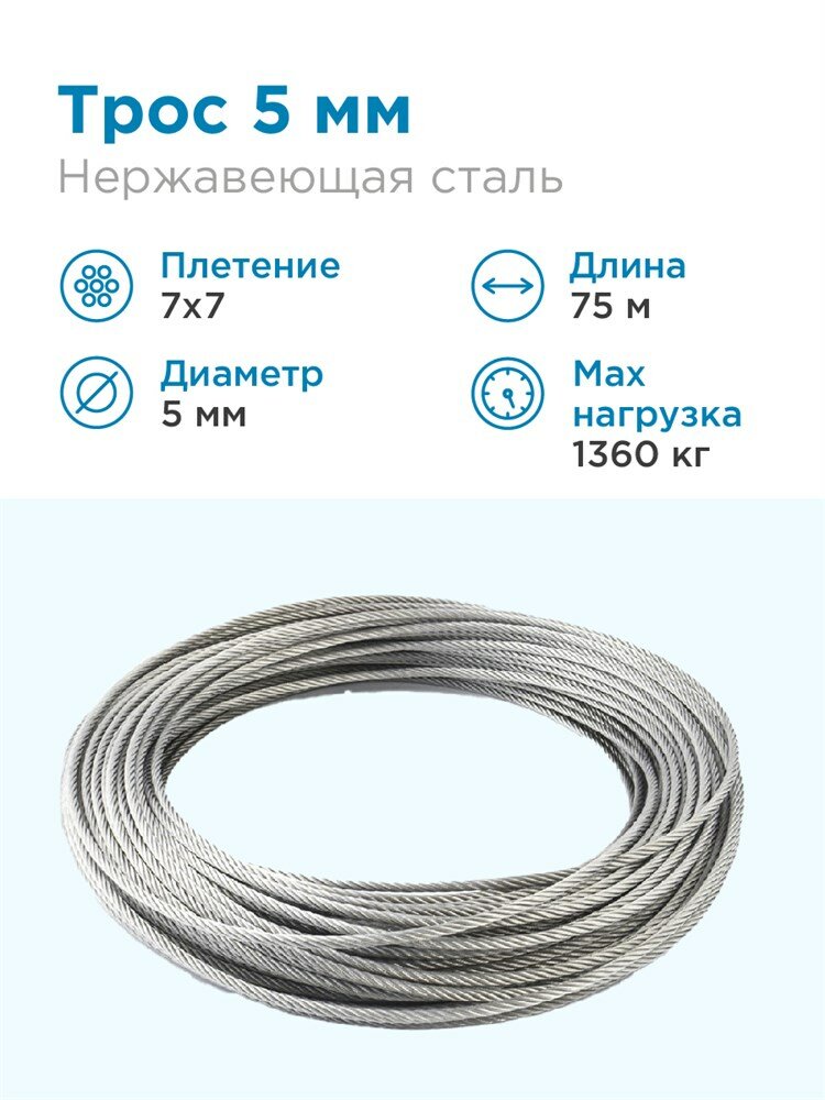 Гидротек Трос нержавеющая сталь 7x7 AISI 304, 5мм бухта 75 метров информация: