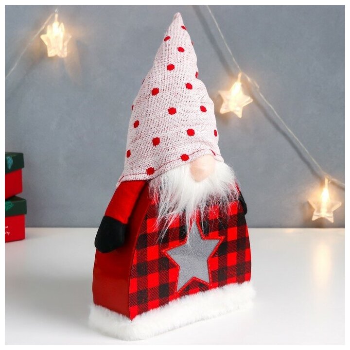 Кукла интерьерная свет "Дед Мороз в клетчатом кафтане, колпак в горох, звёздочка" 41х24х6 см 75679 информация: