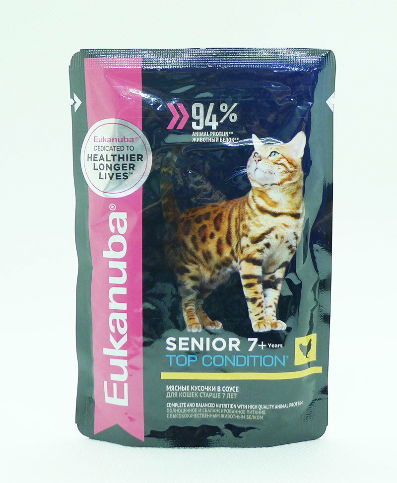 Отзывы на Влажный корм для пожилых кошек Eukanuba Top condition Senior 7+, c курицей, 85 г (кусочки в соусе)