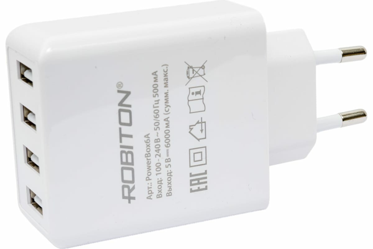 Сетевой блок питания ROBITON PowerBox6A на 4 USB выхода 6000мАч 100-240В