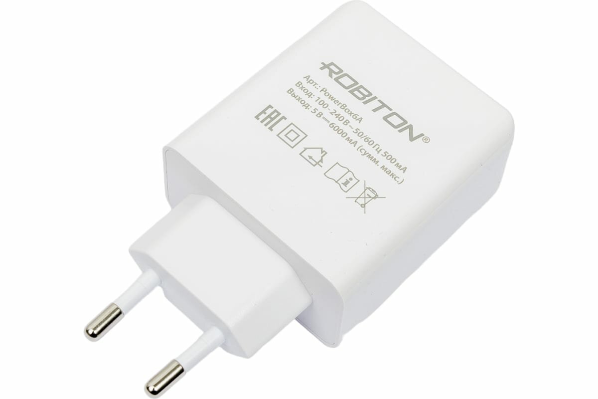 Адаптер питания сетевой белый вход 100-240В выход 4хUSB 5В суммарный ток заряда до 6А (4х1500мА) с высоким КПД - PowerBox6A (Robiton) (код заказа 15399 )