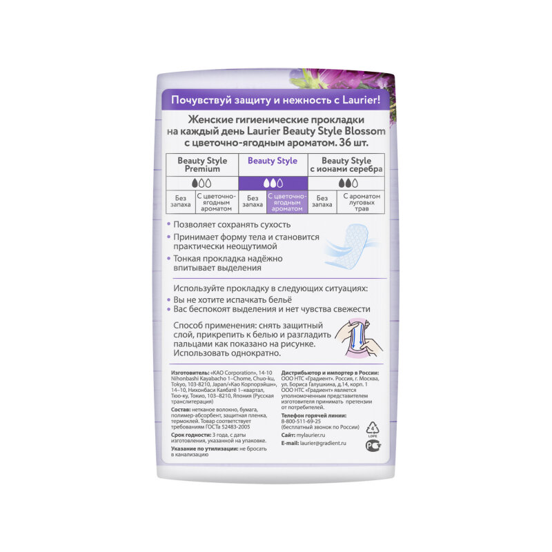 Женские гигиенические прокладки на каждый день, Laurier Beauty Style, Blossom с цветочно-ягодным ароматом, 36 шт информация: