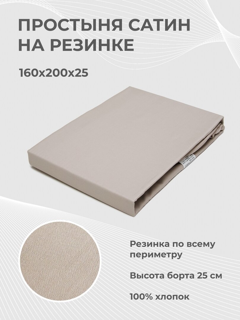 Простыня на резинке из сатина; Бежевая; размер: 160 х 200