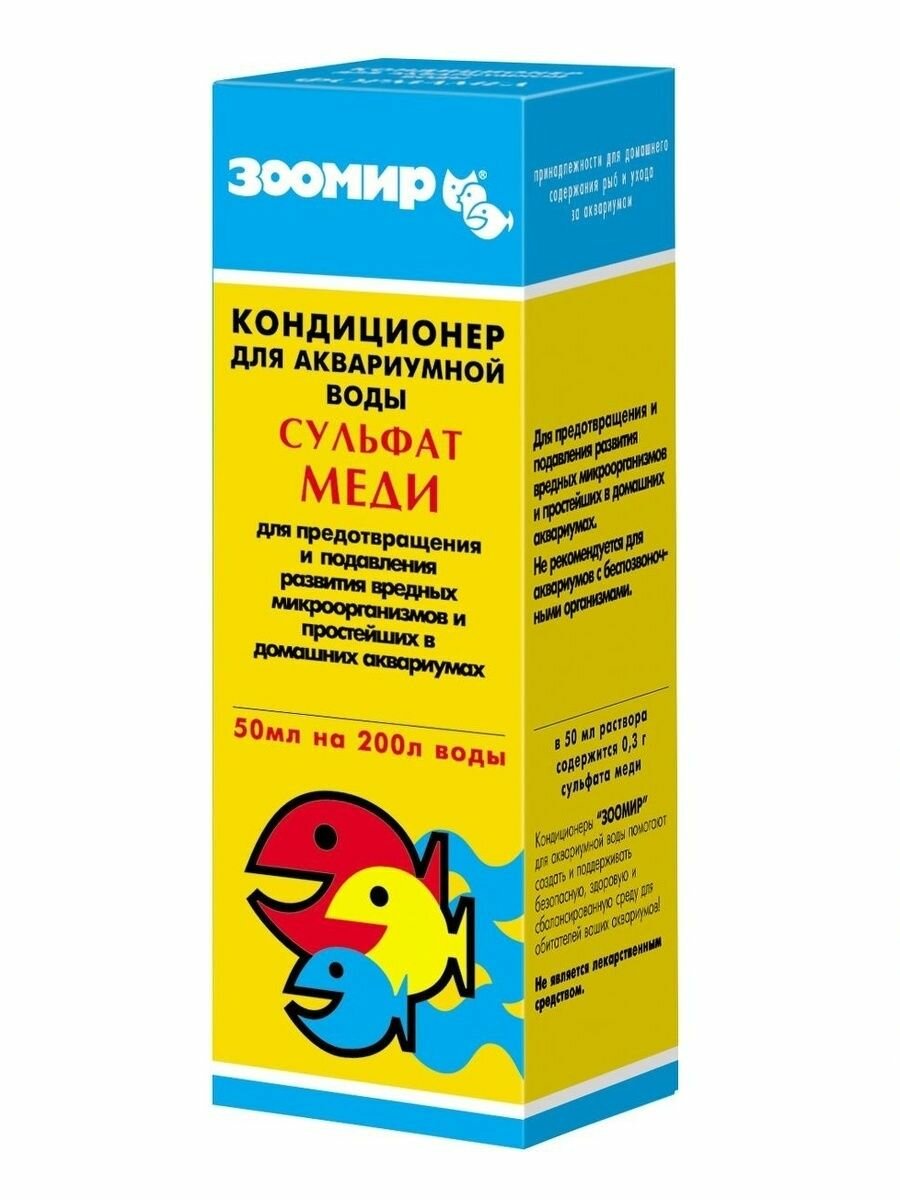 Кондиционер Зоомир сульфат меди для аквариумной воды предотвращение и подавление развития вредных микроорганизмов и простейших, 50 мл информация: