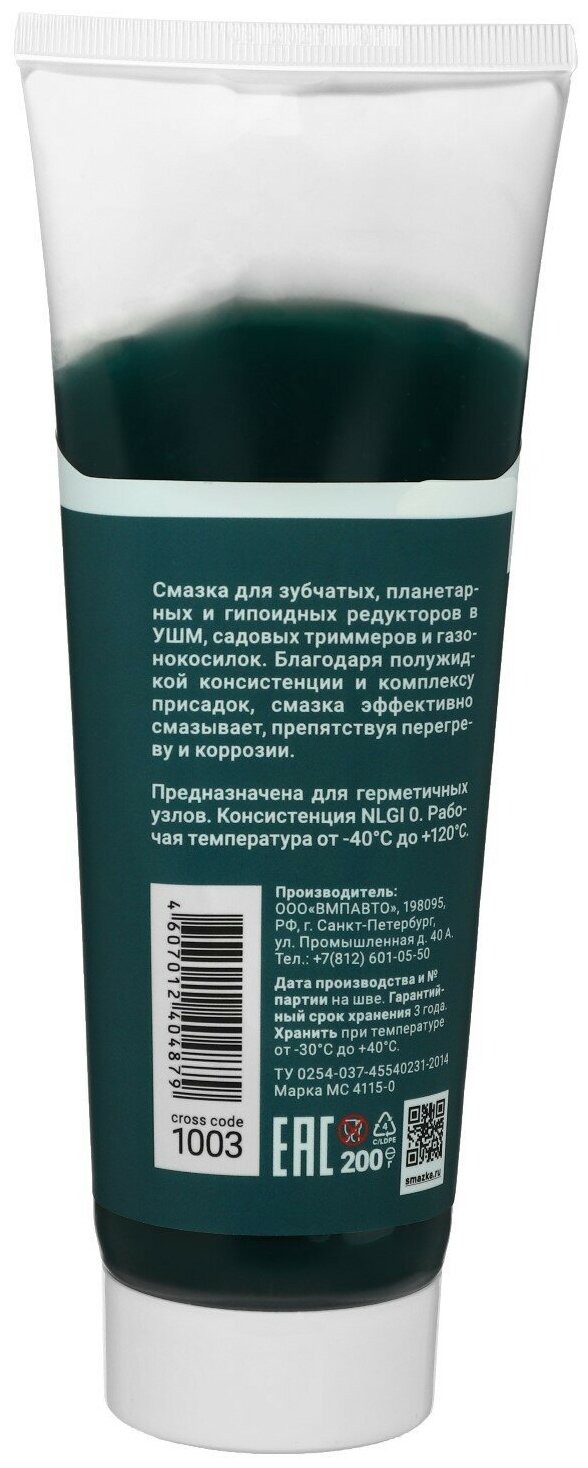 Смазка литиевая 200гр - МС 4115-0 для электроинструмента, препятствует заеданию и ржавлению зубчатых редукторов в УШМ,перфораторах, бензопилах, NLGI 0, зеленая, тюбик