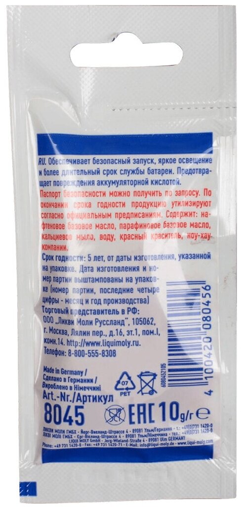 Покрытие для защиты клемм и электроконтактов Liqui Moly Batterie-Pol-Fett, предотвращает коррозию, пакетик 10г, арт. 8045 95 ₽