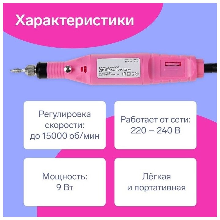 Аппарат для маникюра LuazON LMH-01, 6 насадок, 5 Вт, 3000-15000 об-мин, розовый информация: