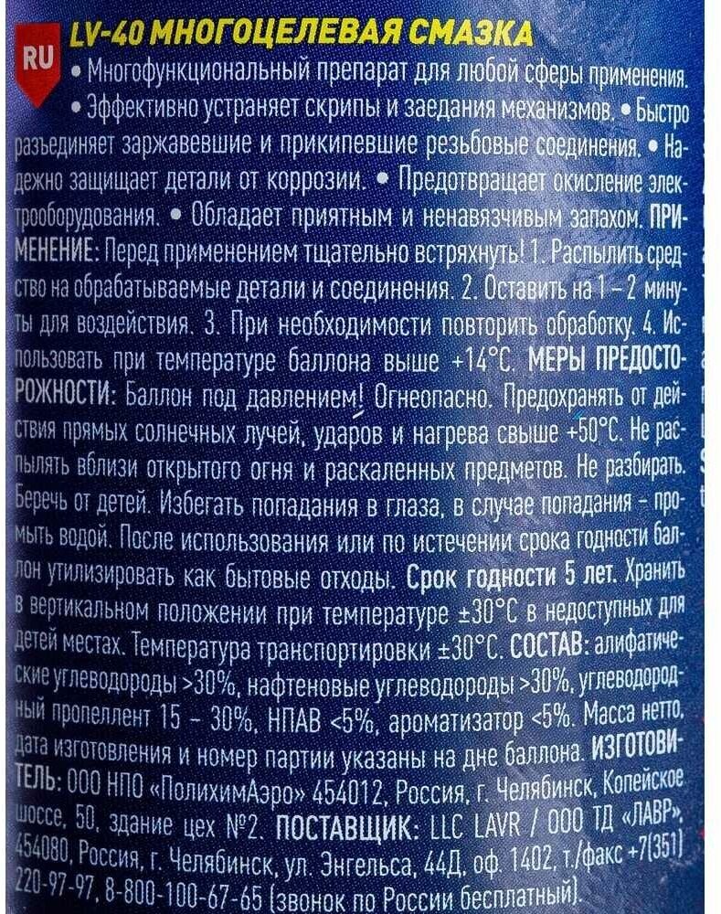 LAVR Смазка многоцелевая LV-40, 210 мл информация: