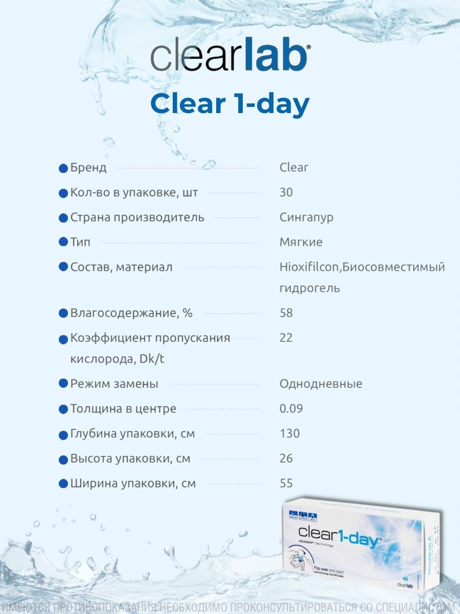 Clear 1-Day 30 линз В упаковке 30 штук Оптическая сила -1.25 Радиус кривизны 8.7 информация: