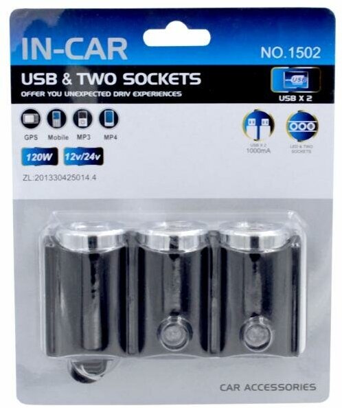 Разветвитель авто IN-CAR NO.1502 (2USB/2гн/120W) (черный)