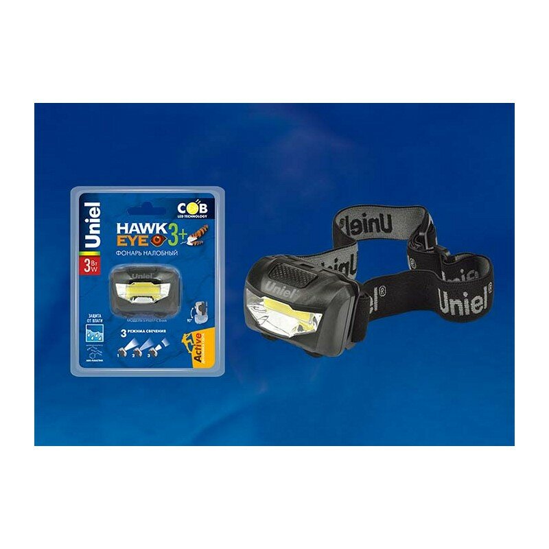 Типы/Уличное освещение/Фонарики Uniel S-HL017-C Black Фонарь налобный TM Uniel, серия Стандарт «Hawkeye- 3Watt+». Пластиковый корпус, COB, 3хААА н/к. Упаковка кламшелл.