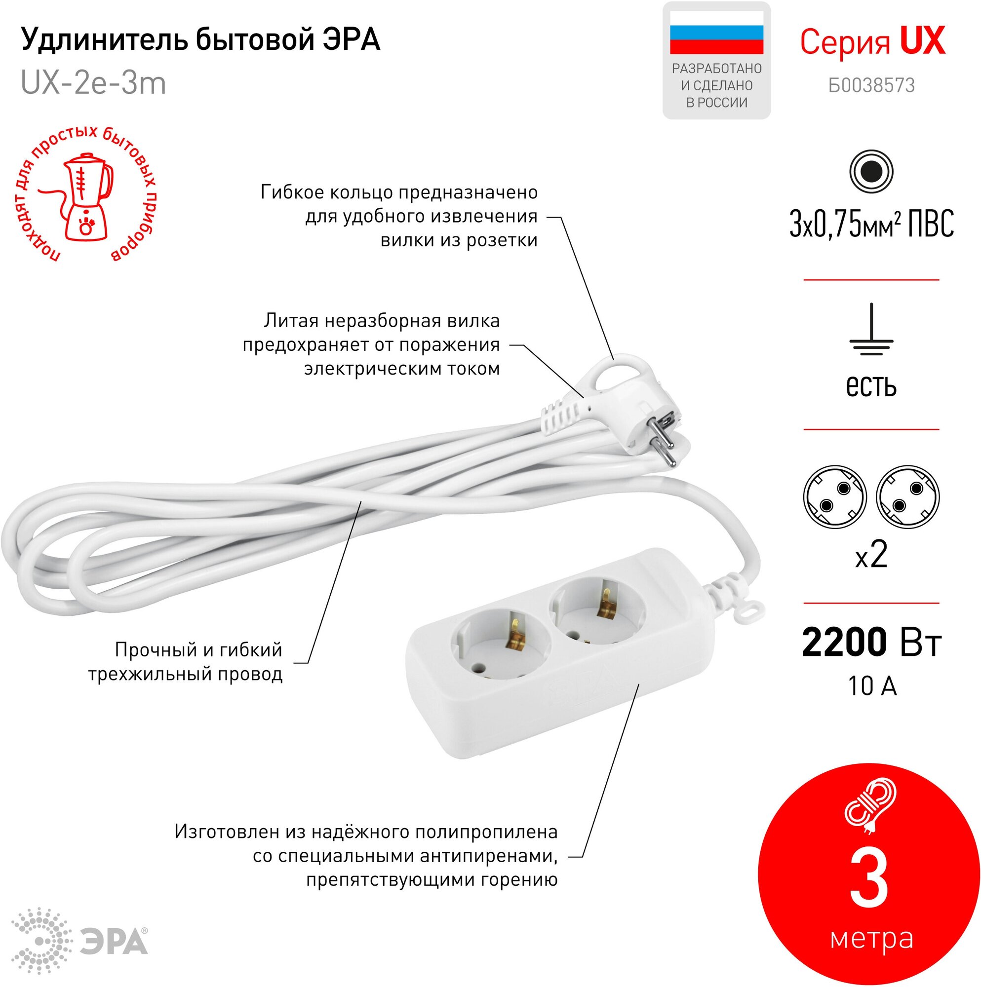 Удлинитель электрический ЭРА UX-2e-3m с заземлением 2 розетки 3м ПВС 3x0,75мм² 10А арт. Б0038573 (1 шт.)