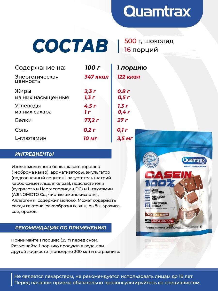 Протеин Quamtrax Nutrition Casein 100%, 500 г / шоколад информация: