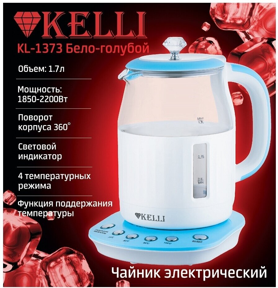 Чайник электрический Kelli KL-1373 / 1.7 л / 2200 Вт / 4 режима / стекло / бело-голубой