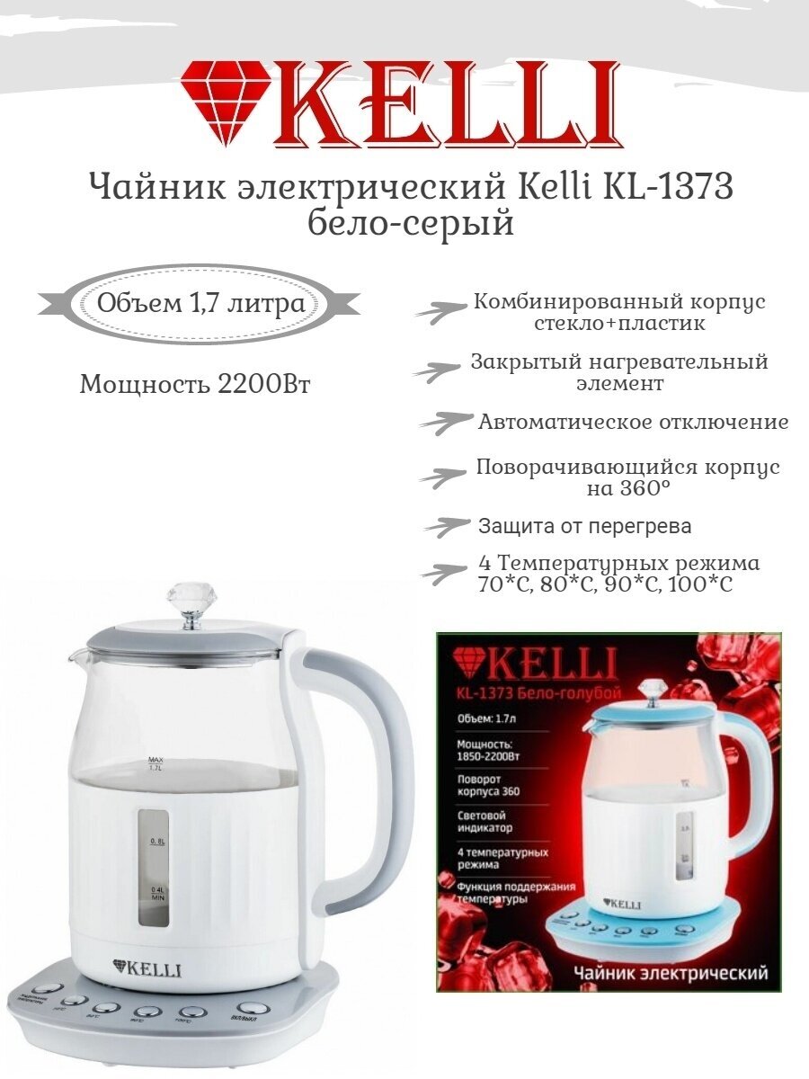 Чайник электрический Kelli KL-1373 / 1.7 л / 2200 Вт / 4 температурных режима / стекло / бело-серый
