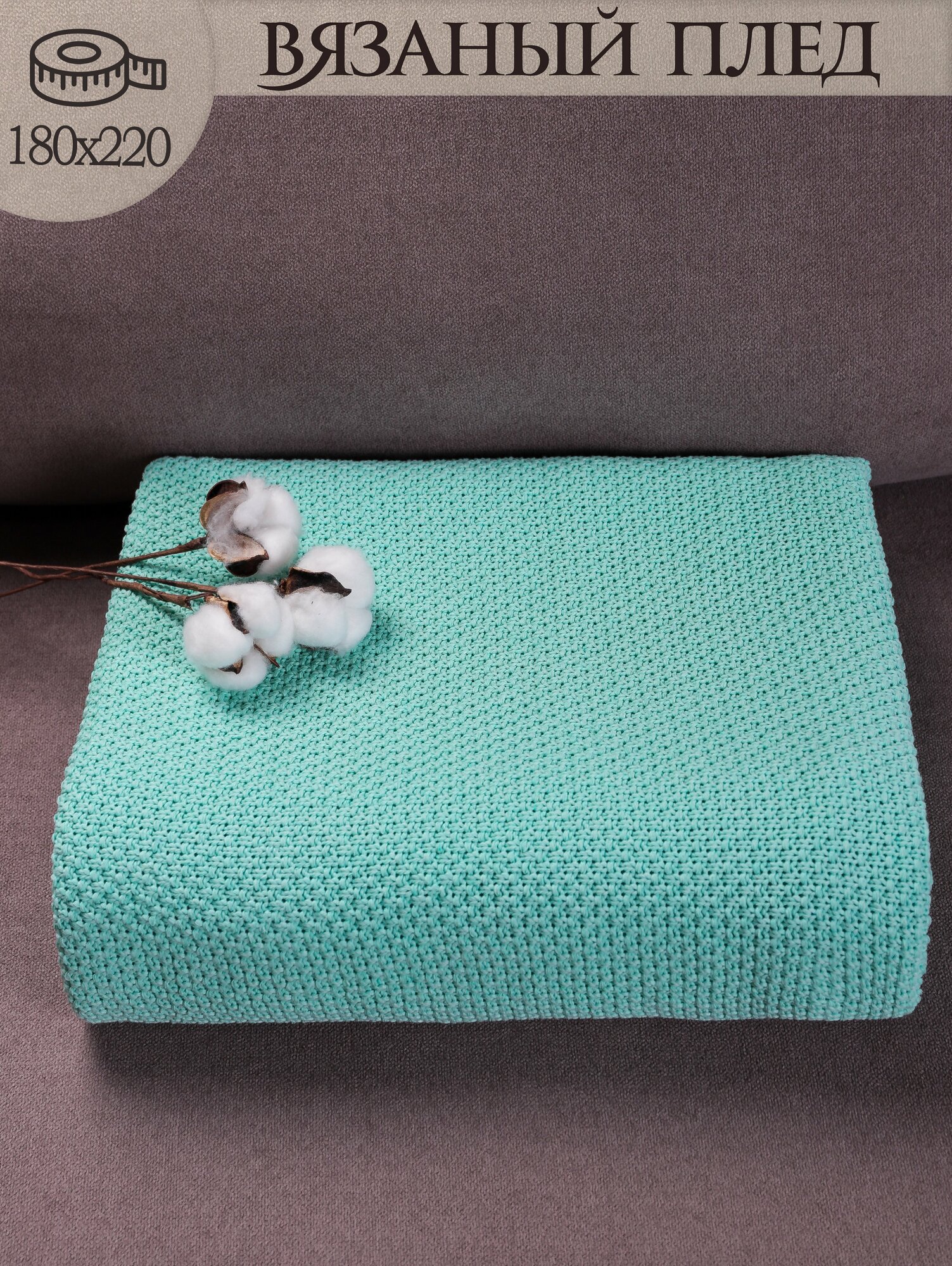 Плед вязаный, Warm Whiff, зеленый, 180х220, хлопок, покрывало для взрослого, дачи, спальни, кровати, однотонное одеяло, в подарок, мягкий