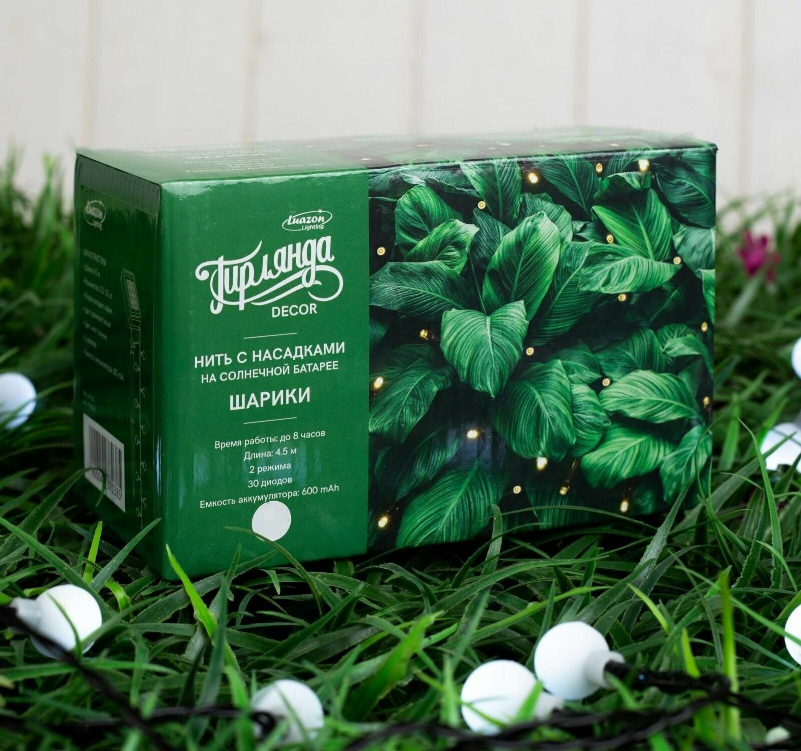 10 цен на Гирлянда "Нить" 4.5 м с насадками "Шарики", IP44, тёмная нить, 30 LED, свечение белое, 2 режима, солнечная батарея