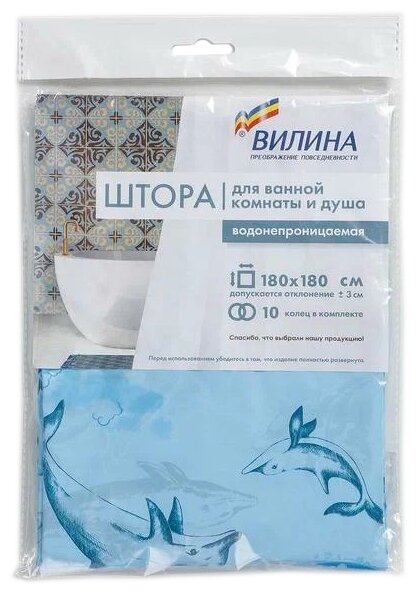 Отзывы на Штора для ванной п/этилен "Дельфины" 180*180см голубая, 10колец 6984 Вилина РФ
