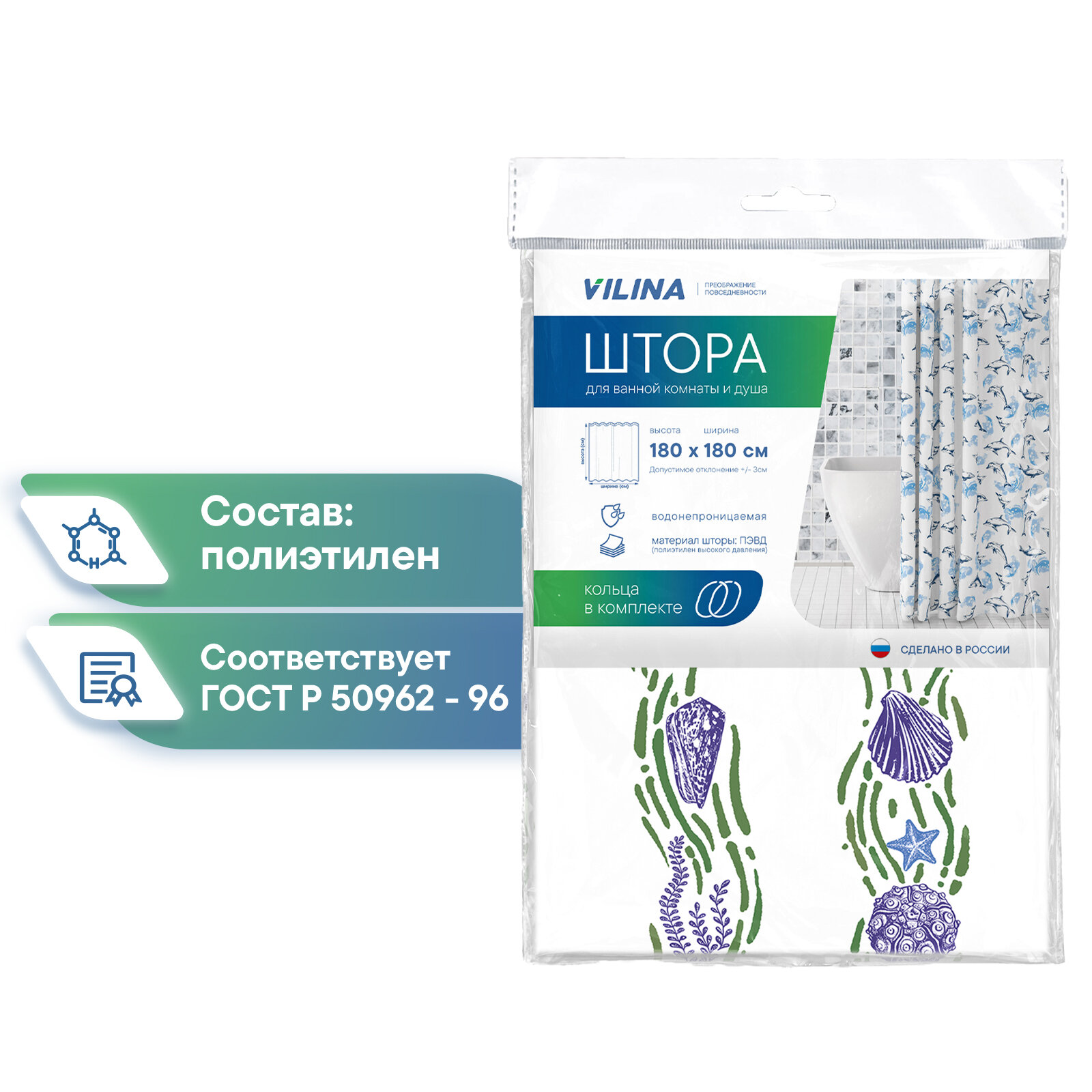 Отзывы на Штора для ванной комнаты VILINA водонепроницаемая с рисунком занавес с кольцами 180х180 см Ракушки белая